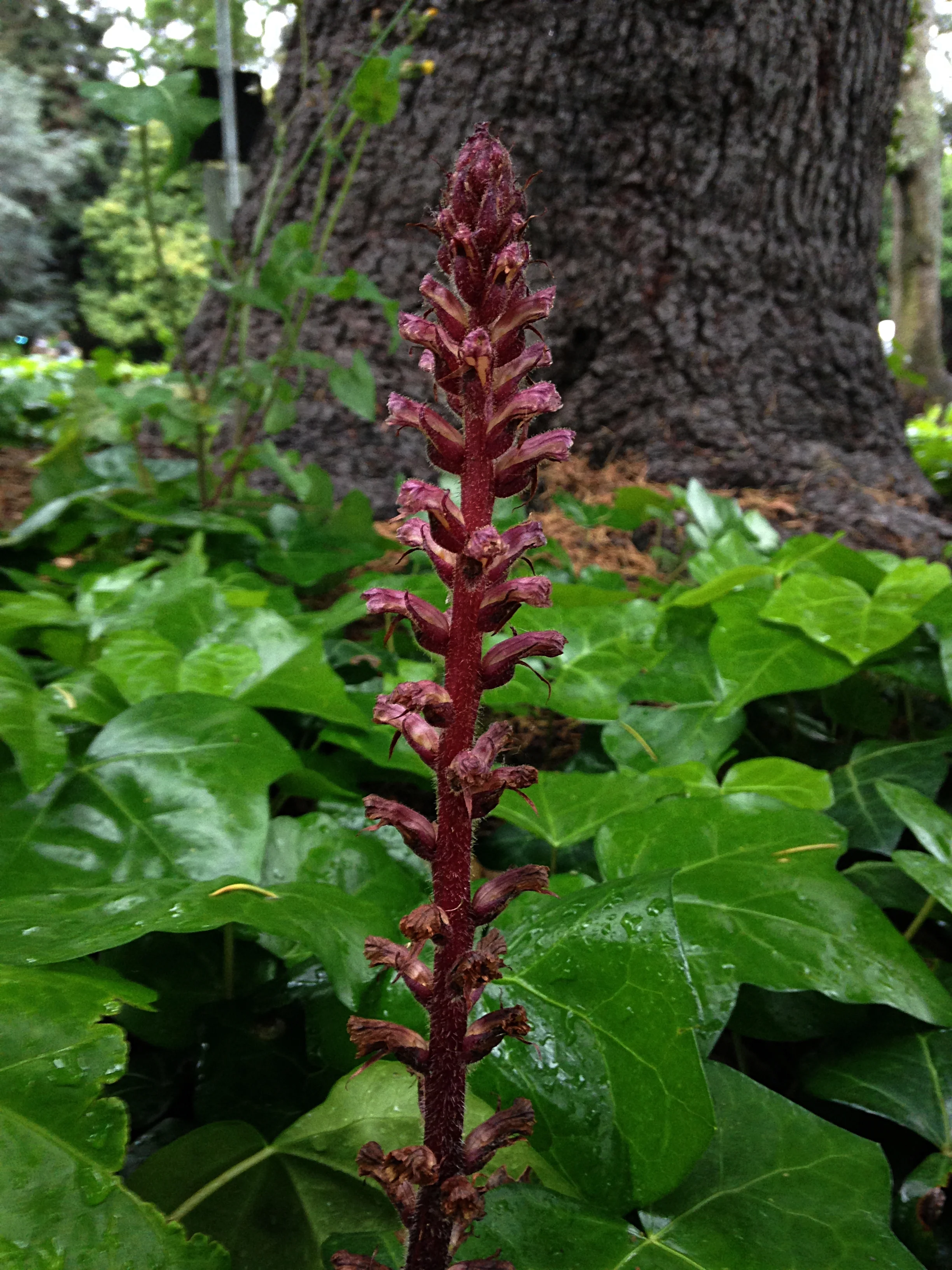 Parasitic plants are fascinating. I never pass up an opportunity to meet them. On a recent trip to California, my host for the day mentioned that something funny was growing in a patch of ivy on the Berkeley Campus. I had to know what it was. We took a detour from our intended rout and there, growing underneath a pine tree in a dense patch of ivy were these odd purple and brown stalks. This was definitely a parasitic plant.