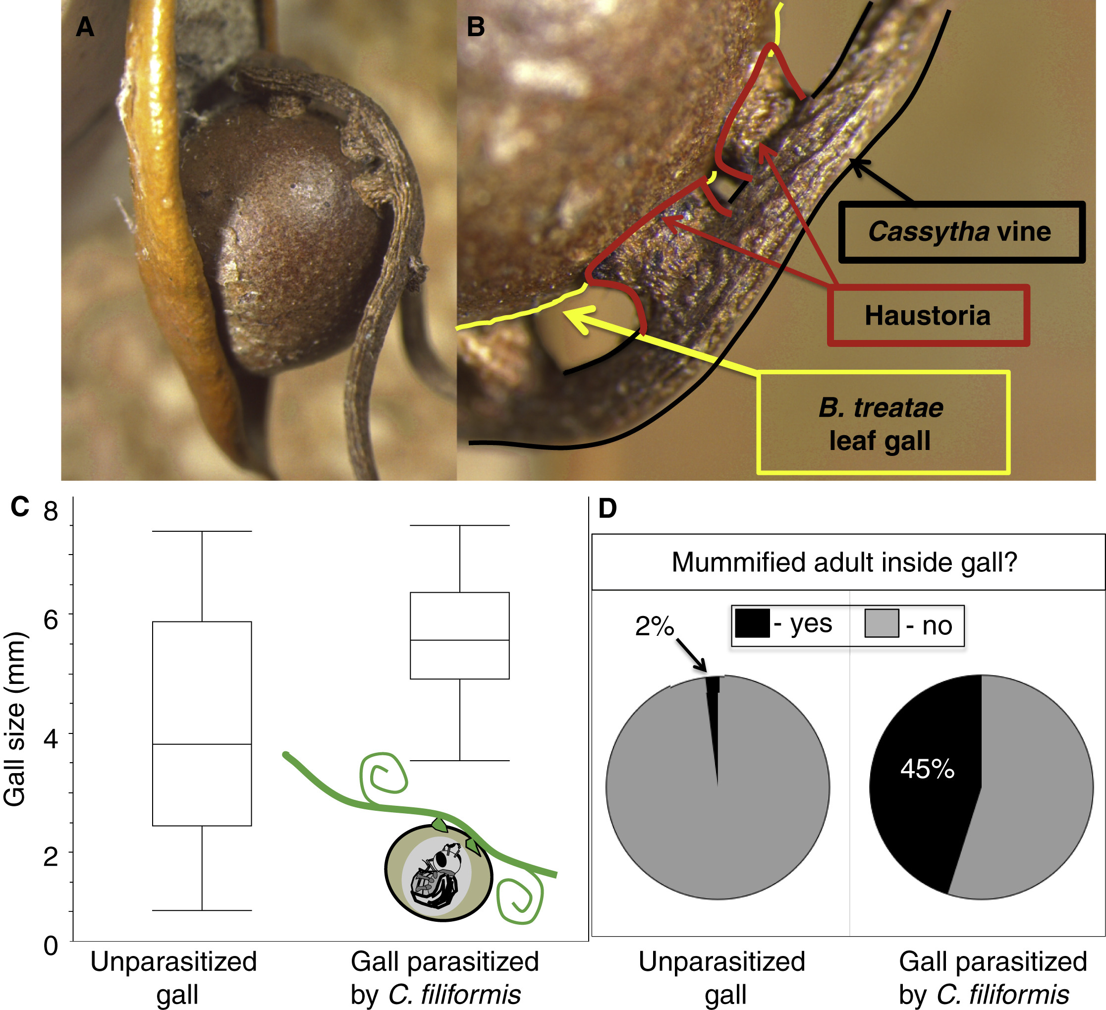 (A) Cassytha filiformis vine attaching haustoria to a leaf gall induced by the wasp Belonocnema treatae on the underside of their host plant, Quercus geminata. (B) Labeled graphic of insect gall, parasitic vine, and vine haustoria. (C) Box plots of leaf gall diameter for unparasitized galls (control) and galls that have been parasitized by C. filiformis. (D) Proportion of B. treatae leaf galls that contained a dead ‘mummified’ adult for unparasitized galls (control) and galls that have been parasitized by the vine C. filiformis. [SOURCE]