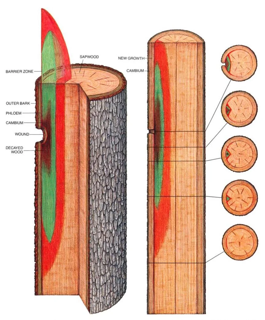 The third response the tree undergoes is to keep growing. New tissues grow around the infected compartment and, if the tree is healthy enough, will outpace further infection. You see, whether its bacteria, fungi, or a virus, microbes need living tissues to survive. By walling off the affected area and pumping it full of compounds that kill living tissues, the tree essentially cuts off the food supply to the disease-causing organism. Only if the tree is weakened will the infection outpace its ability to cope.