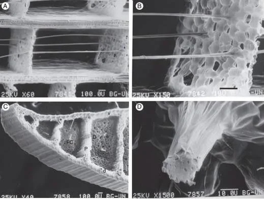 (A) Longitudinal section showing the fibre cables anchored in diaphragms composed of aerenchyma tissue. (B) Longitudinal section showing the fibre cables anchored in diaphragms composed of aerenchyma tissue. (C) Cross section. The thick ventral (v)and dorsal (d) surfaces of the leaf are separated by thick partitions (P) that run the length of the leaf. Thin diaphragms (D) connected perpendicular to the thick partitionsare traversed by very fine fibre cables (FC), which are anchored to them. This construction has often been compared to sandwich-type construction, giving a low-density structure of high stiffness and strength (Rowlatt and Morshead, 1992)