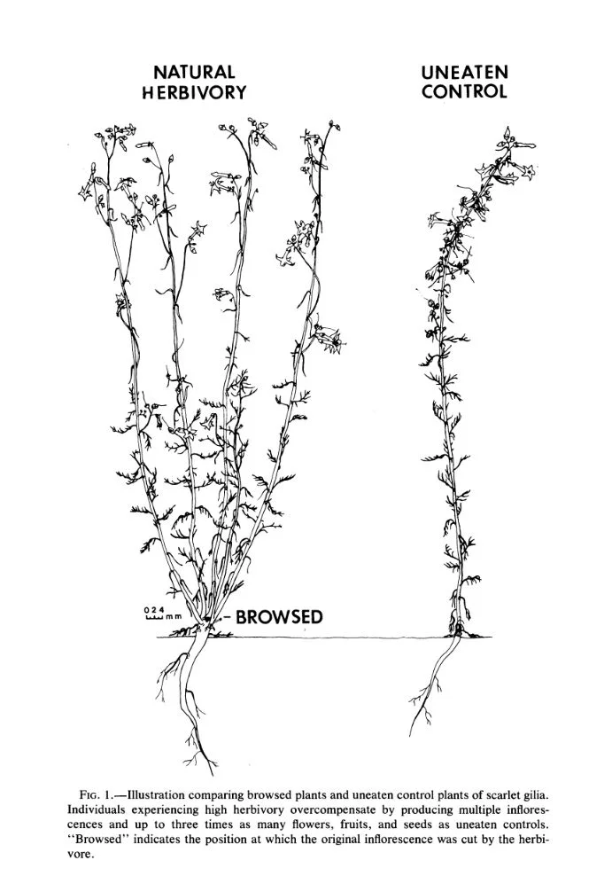Research on scarlet gilia (Ipomopsis aggregata), a biennial native to western North America, suggests that overcompensation comes into play only when environmental conditions are most favorable. Soil nutrients seem to play a role in how well a plant can bounce back following herbivore damage. When resources are high, the results can be quite astounding. Early work on this species showed that under proper conditions, plants that were browsed by upwards of 95% produced 2.4 times as much seed as uneaten control plants. What's more, the resulting seedlings were twice as likely to survive than their uneaten counterparts.