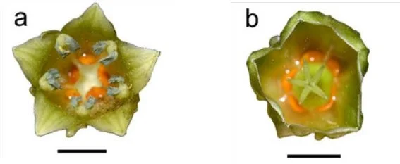 Male flower (a) and female flower (b). Note the presence of the orange glands at the base.