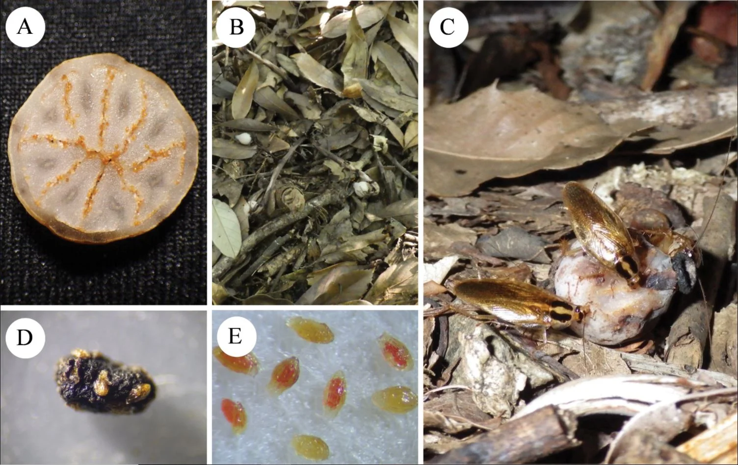 (A) M. humile fruit showing many minute seeds embedded in the less juicy pulp. (B) Fallen fruits. (C) Blattella nipponica feeding on the fruit. (D) Cockroach poop with seeds. (E) Stained cockroach-ingested seeds. [SOURCE]