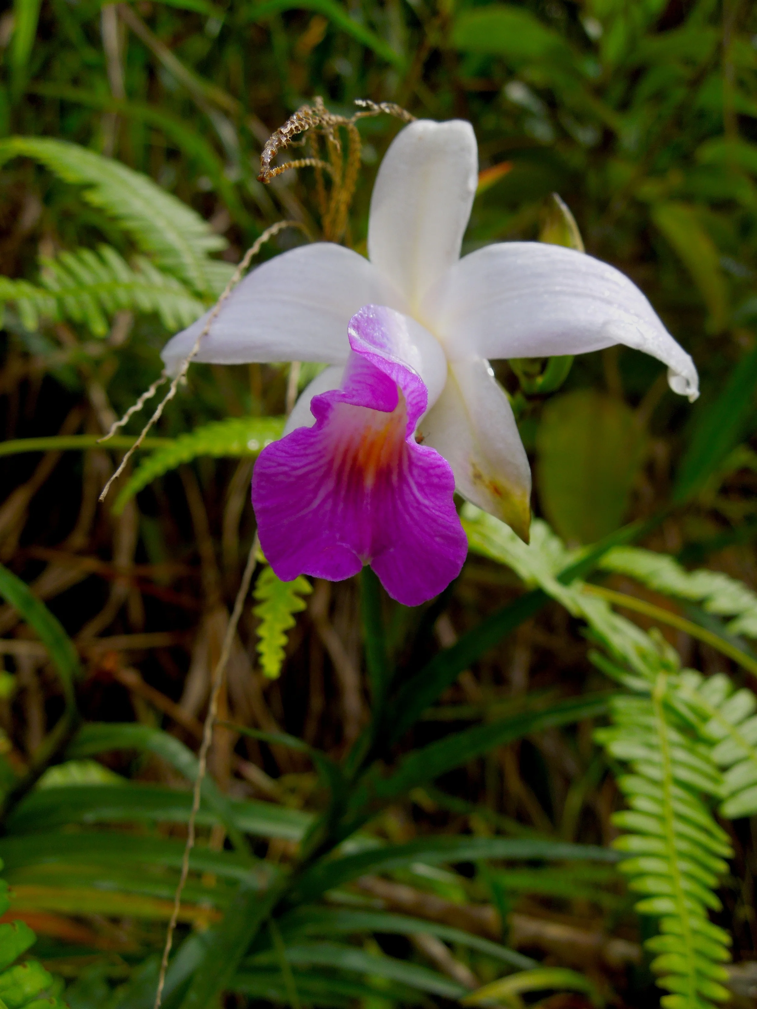 Like a kid in a candy shop, the scenery had my complete attention. The combination of the size of the bus and the elevation that we had to climb meant that the ride was slow enough that I could actually do some botanizing from the window. Again, I had almost no idea what I was seeing. The only plants I was remotely able to recognize were some sort of Dicranopteris fern that covered exposed roadsides and plenty of bamboo orchids (Arundina graminifolia), a species that has naturalized throughout the tropics but was originally native to parts of Asia. The rest quickly became a green blur of tree ferns, palms, and other tropical looking trees. I couldn't wait to explore with someone who knows a thing or two about Costa Rican flora.