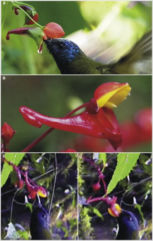 Thanks to remote cameras and lots of patience, botanists were able to record pollination events. They quickly realized that sunbirds are indeed the primary pollinator of this species. This was a bit of a surprise given the shape of the flower. However, the way in which the flowers deposit pollen on this birds is what is most remarkable. As it turns out, successful reproduction in I. frithii all comes down to that curved nectar spur.
