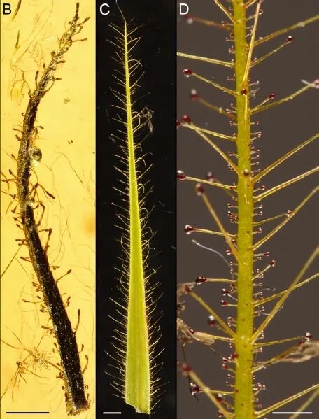 Carnivorous leaves from Eocene Baltic amber. (A) Overview of the leaf enclosed in amber showing the adaxial tentacle-free side in slightly oblique view and stalked glands at the margin and on the abaxial side; arrowhead points to the exceptional long tentacle stalk with several branched oak trichomes attached. (B) Overview of the leaf enclosed in amber, showing abundant tentacles on the abaxial side. (C) Margin of abaxial leaf surface with tentacles of different size classes and nonglandular trichomes [SOURCE]