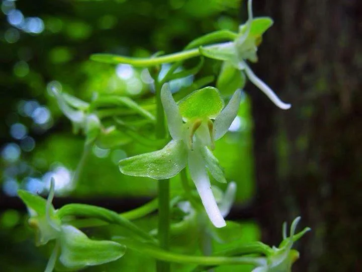 When conditions are right and the plants have enough stored energy they will begin to flower. Rising from the middle of the pair of leaves is a decent sized inflorescence loaded with greenish white flowers. The flowers are interesting structures. Not particularly colorful, they have a long white lip and considerable green nectar spurs. There are said to be two varieties of this species, each being characterized by the length of the nectar spur. Unlike many orchids that offer no reward to pollinators, P. orbiculata produces nectar. The flowers are pollinated by noctuid moths, which is probably why they are white in color. Whereas most lepidopteran pollinated orchid attach their pollinia to the proboscis of the butterfly or moth, P. orbiculata attaches its pollinia to the eyes of visiting moths.