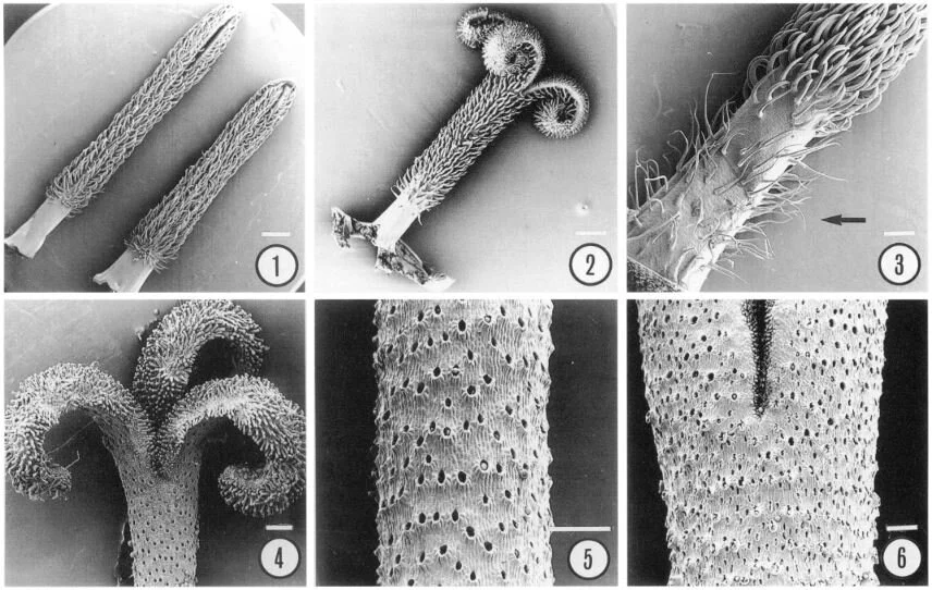Pollen collecting hairs on 1) Campanula barbata; 2) Campanula kremeri; 3) Campanula dichotoma; 4 - 6) Cavities in which pollen collecting hairs have retreated. [SOURCE]