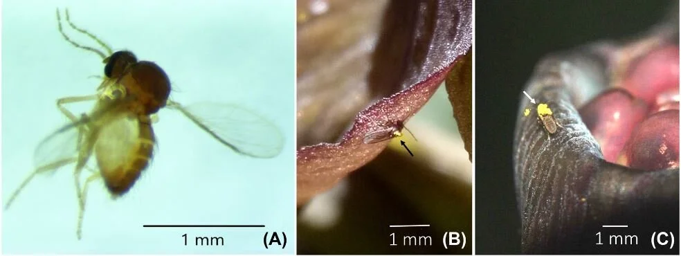 (A–C) Female Forcipomyia biting midge. Arrows indicating pollen grains. [SOURCE]