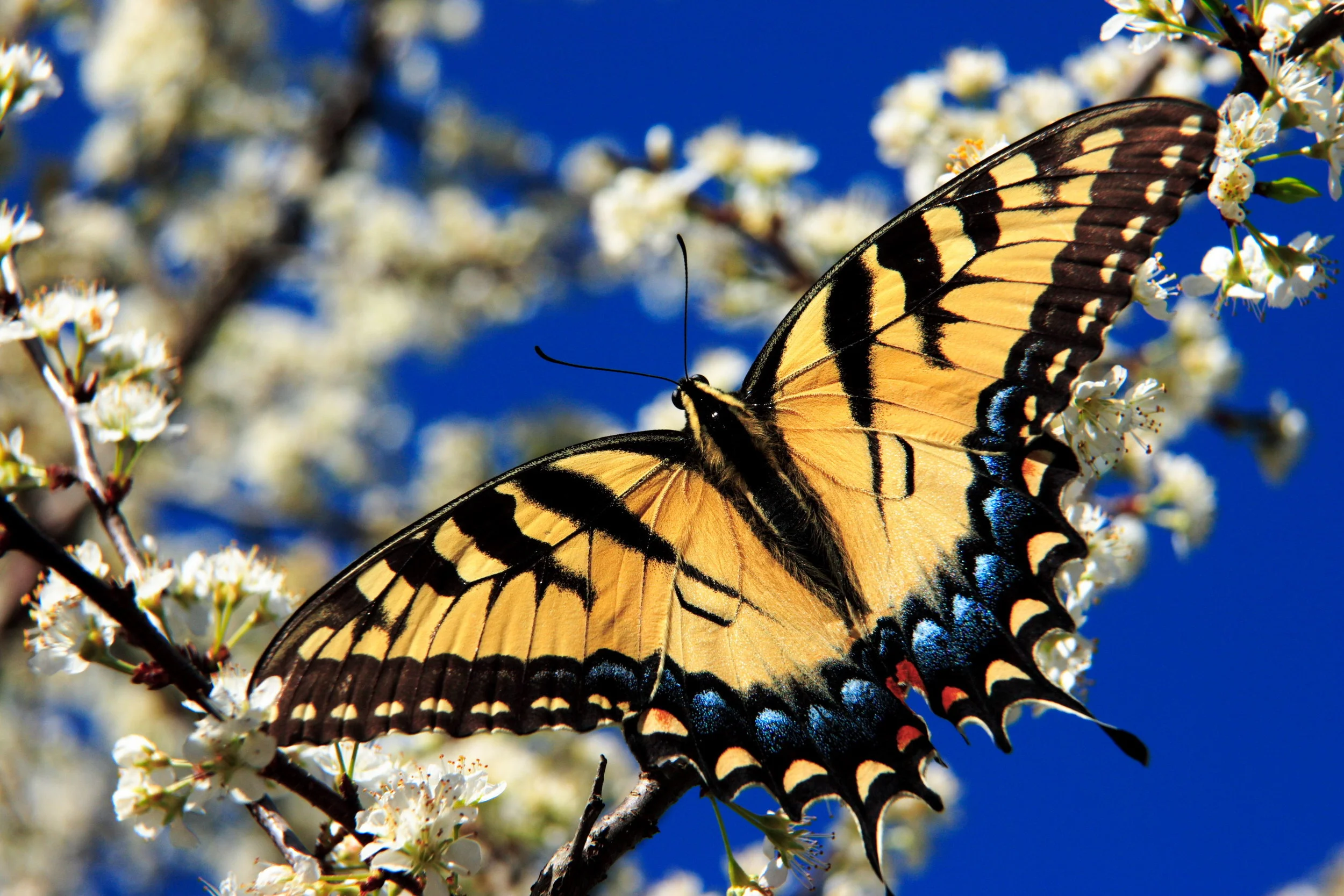 Only two species of butterfly, the eastern tiger swallowtail and the orange spangled fritillary, were observed to possess the right wing size and placement to achieve effective pollination for the flame azalea (though I suspect other larger species do so as well). This is quite unique as this is the only report of wing-mediated pollen transfer in northern temperate regions. The research team that discovered this noted that pollen transfer was greatest with the eastern tiger swallowtail, which is a voracious nectar hunter during the summer months.