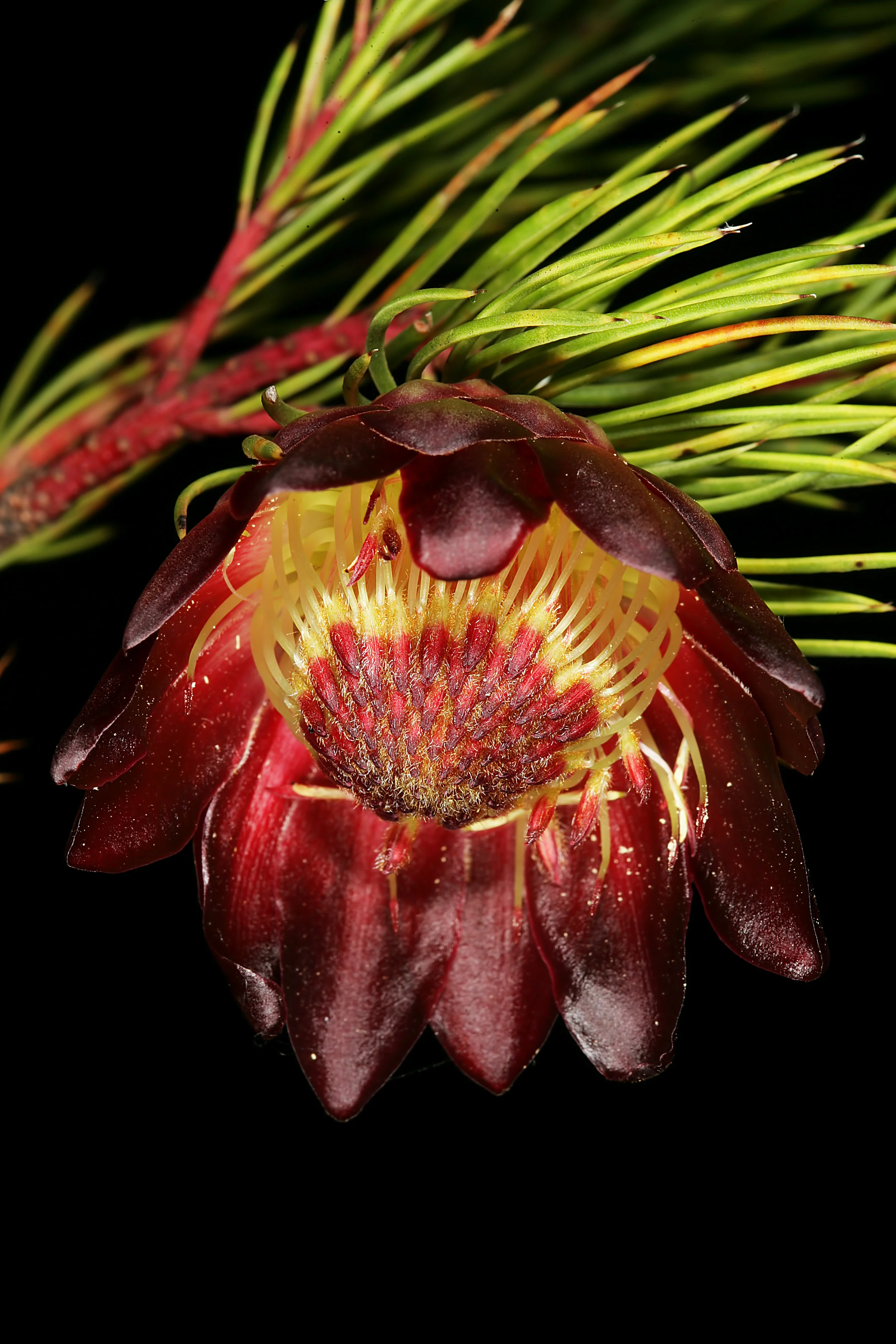 The various members of Proteaceae are probably best known for their bizarre floral displays. Indeed, they are most often encountered outside of their native habitats as outlandish additions to the cut flower industry. Superficial interest in beauty aside, the floral structure of the various protea genera and species is complex to say the least. They are well adapted to ensure cross pollination regardless of what the inflorescence attracts. Most notable is the fact that pollen doesn’t stay on the anthers. Instead, it is deposited on the tip of a highly modified style, which is referred to as the pollen presenter. Usually these structures remain closed until some visiting animal triggers their release.