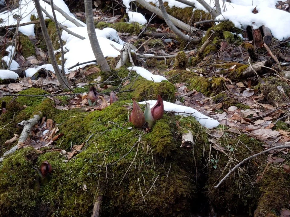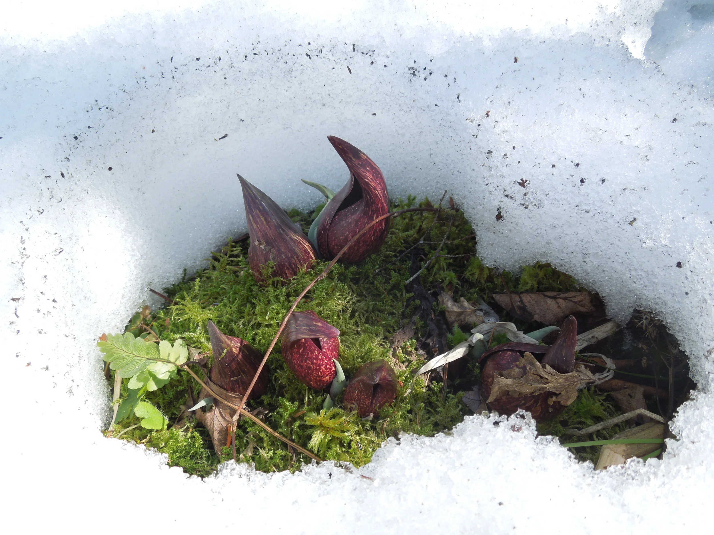 Skunk cabbage is a true spring wildflower. It is also one of those small groups of plants that can generate their own heat. This aroid can literally melt its way through the snow cover. Skunk cabbage hails from the same family of plants as the titan arum, Araceae. The inflorescence emerges in early spring, oten before the snow (if there is any) has had a chance to melt. Using heat generated via a unique form of metabolic activity, the inflorescence can reach temperatures of 15-25°C (59-77°F).